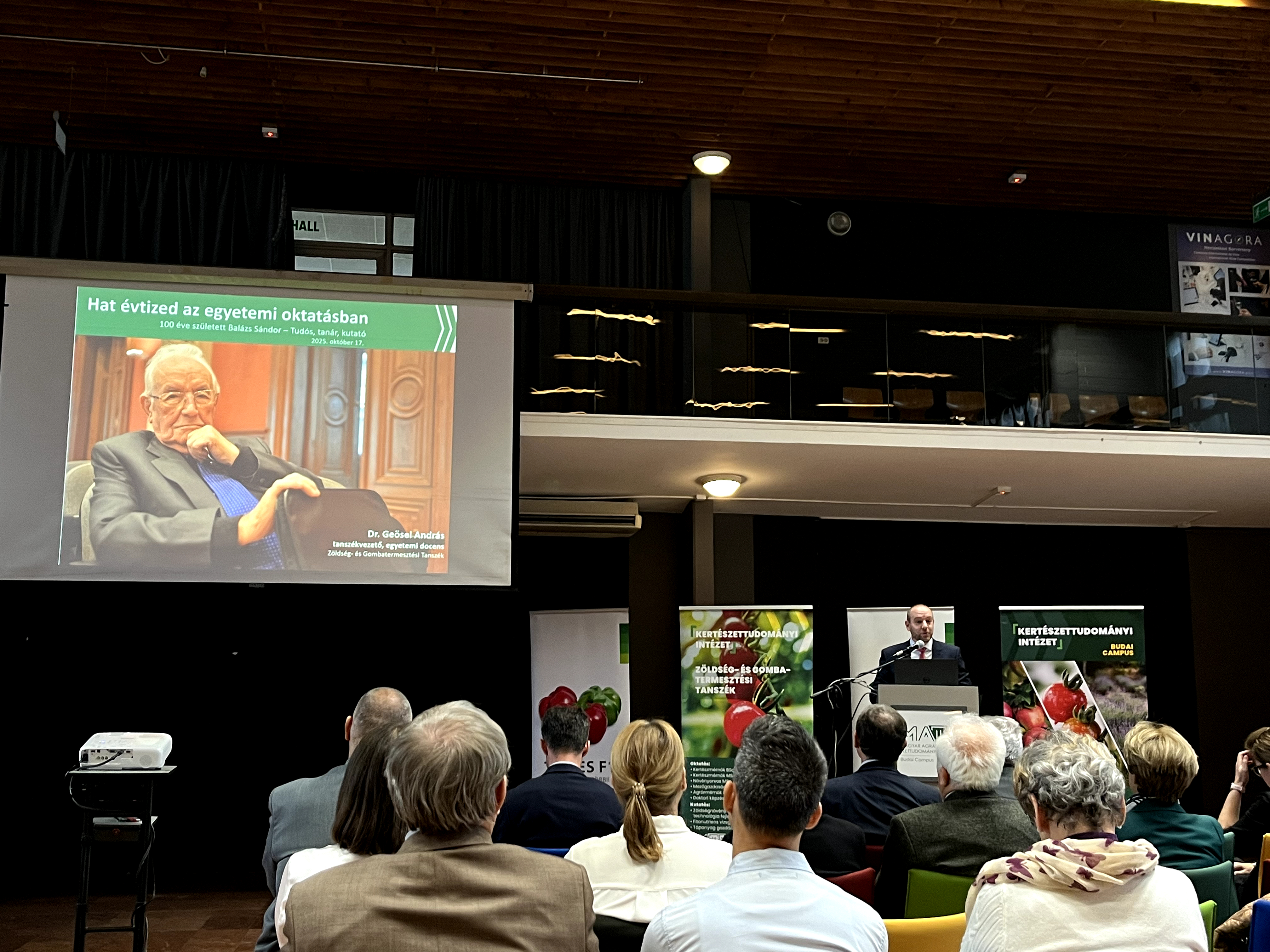 Dr. Balázs Sándor 1925-ben született Szegváron, középiskolai tanulmányait Szentesen folytatta, ahol két év szovjet hadifogságot követően érettségizett. Az Agrártudományi Egyetem Kert- és Szőlőgazdaság-tudományi Karán mérnöki oklevelet 1952-ben szerzett. A Kertészeti és Szőlészeti Főiskolán lett előbb tanársegéd, majd az egyetemi ranglétrán haladva 1959-ben docens, 1982-ben egyetemi tanár. A MATE jogelődjeinél végzett oktatói-kutatói munkásságát dr. Geösel András, a MATE Zöldség- és Gombatermesztési Tanszék vezetője méltatta. Előadásában kiemelte, hogy professzor úr személyében a szakma által nagyra értékelt és tisztelt kollégát ismerhettünk meg, akinek munkásságát 22 szak- és tankönyv, 2 szabadalom, 7 végzett PhD jelzi.